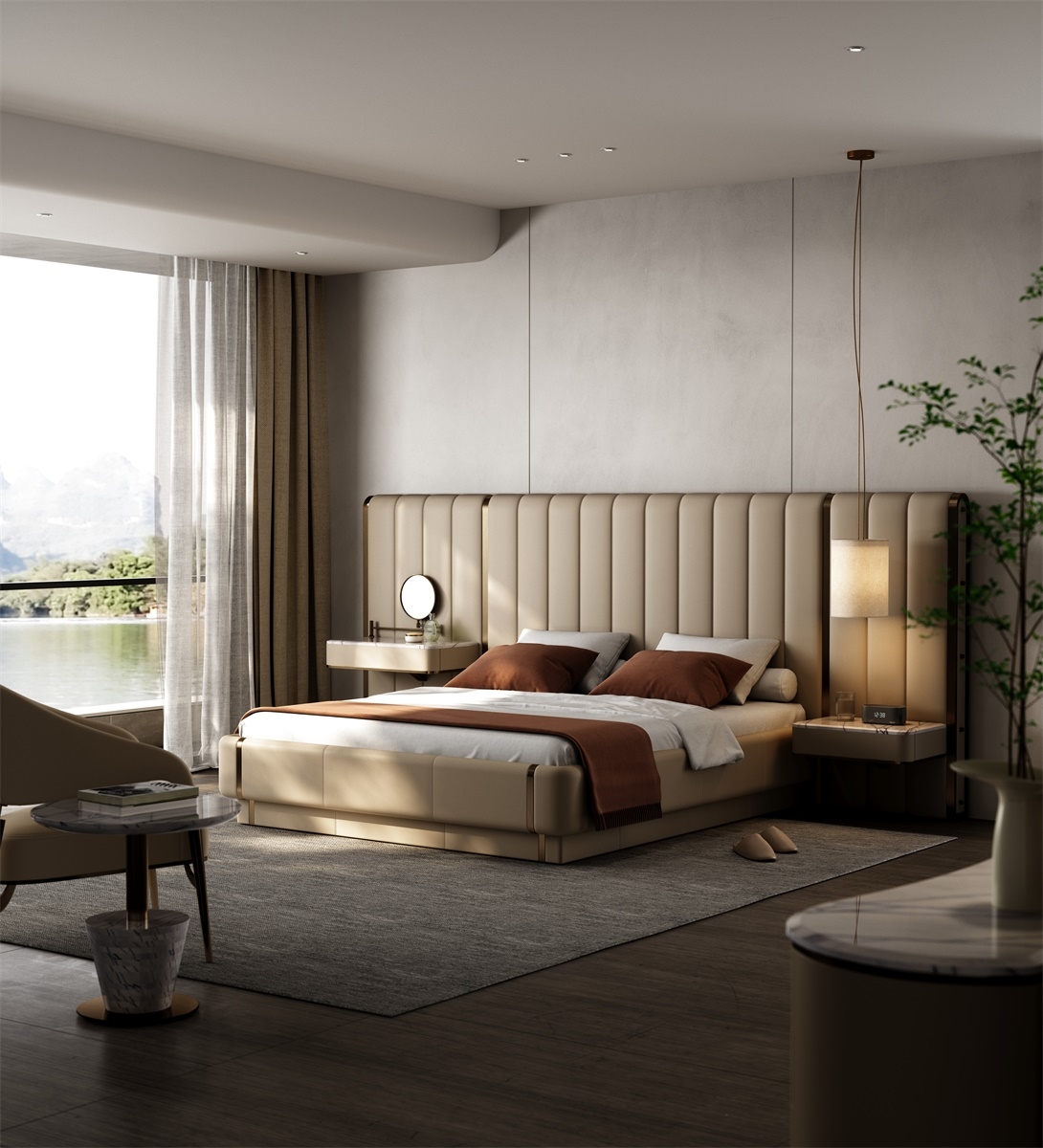 Based on the consideration of Tianhe and human rationality, use symmetrical techniques to design and achieve a perfect state.This bedroom set features a seamlessly integrated design, with the bed, headboard, and side units forming a cohesive and stylish whole. The vertical tufting on the headboard and side panels adds a touch of sophistication and a sense of height to the room.