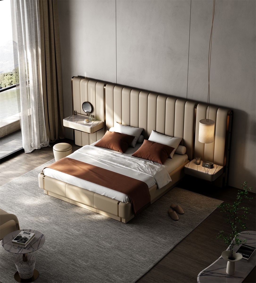 The design of relative symmetry adds stability and symmetrical beauty to the product; The soft bag headboard, which combines leather and metal, not only continues the modern luxury aesthetics, but also ensures a comfortable and practical experience.