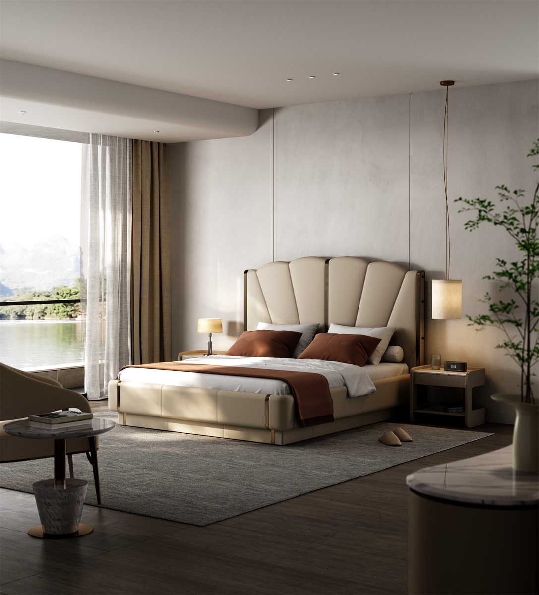 Inspired by the deep sea, it contains all kinds of things in the world, simulating the shape of shells or extracting the beauty of inner lines, interpreting luxury and elegance with modern design.Iconic Shell - Inspired Headboard: Features a sculptural, fan - shaped headboard with soft curves and vertical tufting. The neutral beige tone and metallic accents create a glamorous, hotel - worthy look—perfect for elevating any bedroom into a luxury retreat.