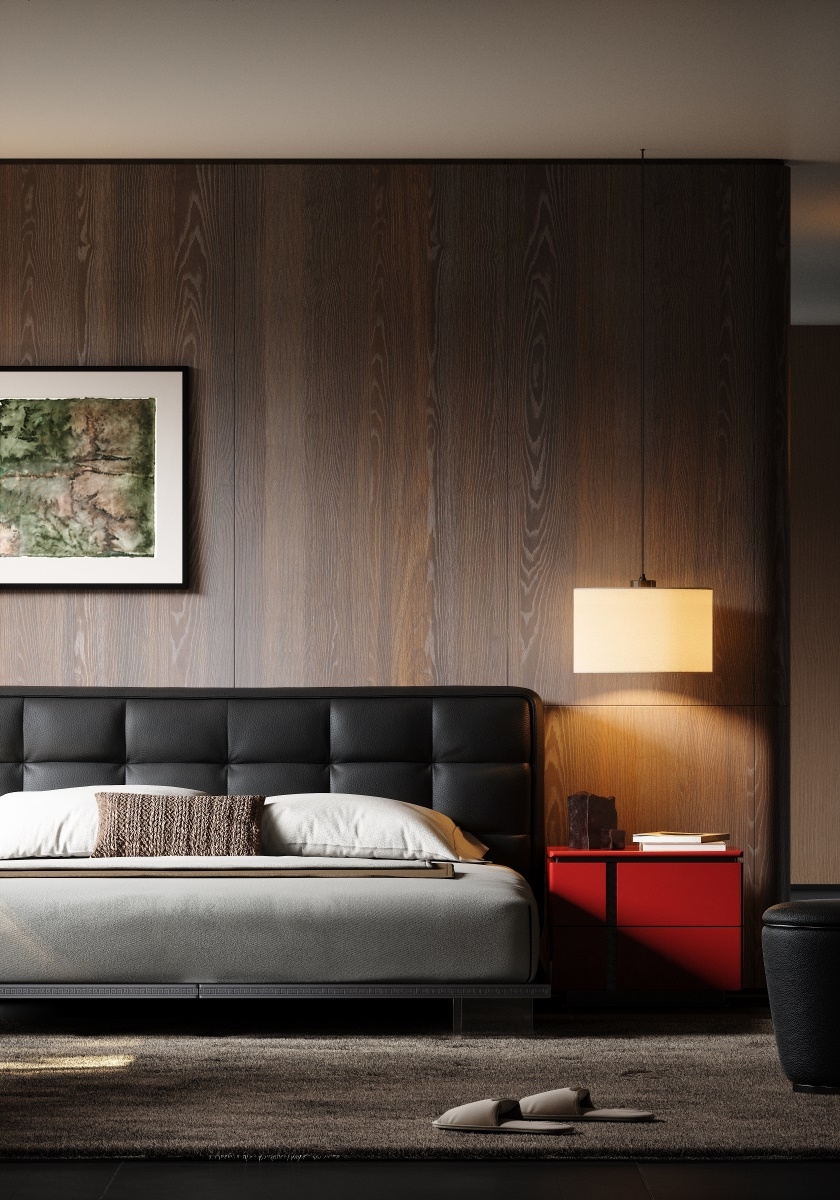 The headboard, crafted from premium black leather, showcases a meticulously stitched, paneled design that radiates refined elegance.