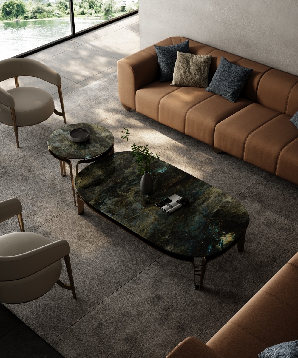 The elliptical outline is suitable for various living room layouts. The spacious countertop can display artistic ornaments, tea sets, etc., serving as a carrier for spatial interaction and display. The natural properties of stone combined with the exquisite craftsmanship of metal make it not only a practical piece of furniture but also an artistic item that enhances the style of the space. It meets the dual pursuit of quality and beauty in high-end home furnishings and showcases the owner's unique taste for a refined life.