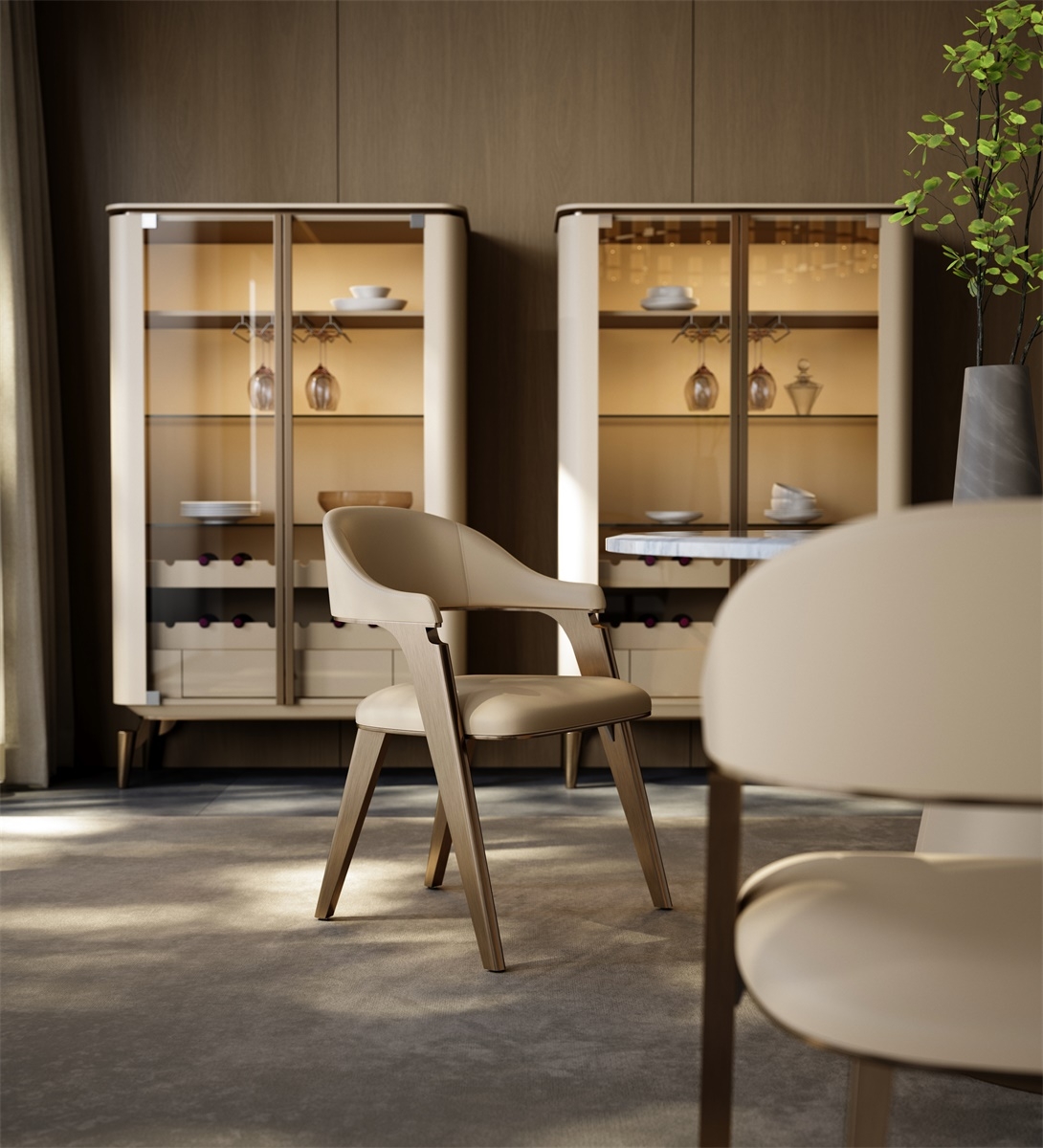 Sink into the luxury of this armchair, where sumptuous beige leather meets warm - toned wooden craftsmanship. The curved backrest embraces you in comfort, while the sleek wooden frame adds a touch of refined elegance.It’s more than seating; it’s a symphony of style and substance. Let it transform your dining or living space into a haven of sophistication, a perfect blend of artistry and comfort for those who appreciate life’s finer details.