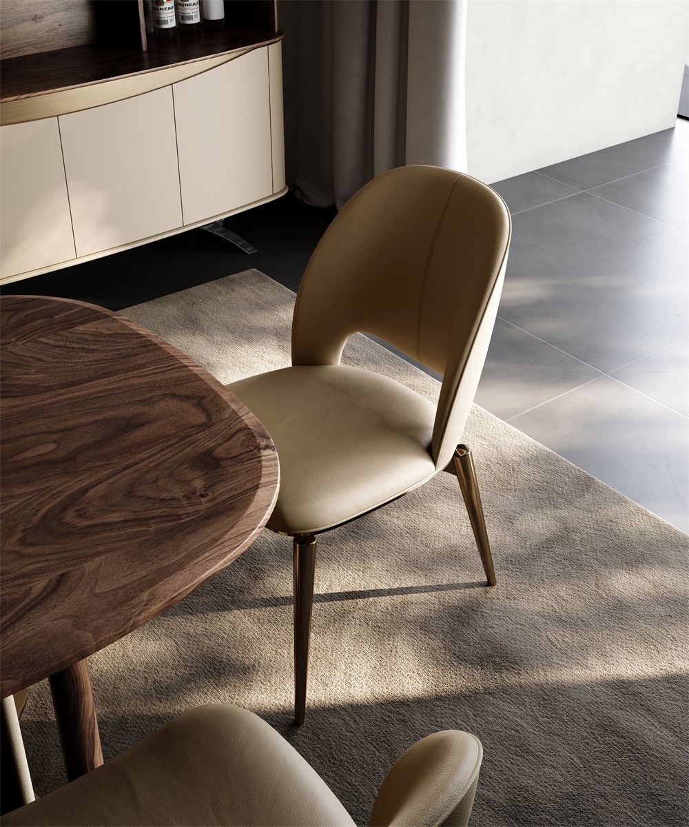 The unique curved backrest is designed according to the curve of the human back, which can provide good support and effectively relieve the fatigue caused by long-term meals; the seat is filled with high-elastic sponge, which is soft and has good resilience, and the wide seat design meets the needs of different body shapes; the tapered metal legs not only enhance the stability of the chair, but also create a sense of lightness visually, achieving a perfect combination of comfort and beauty.