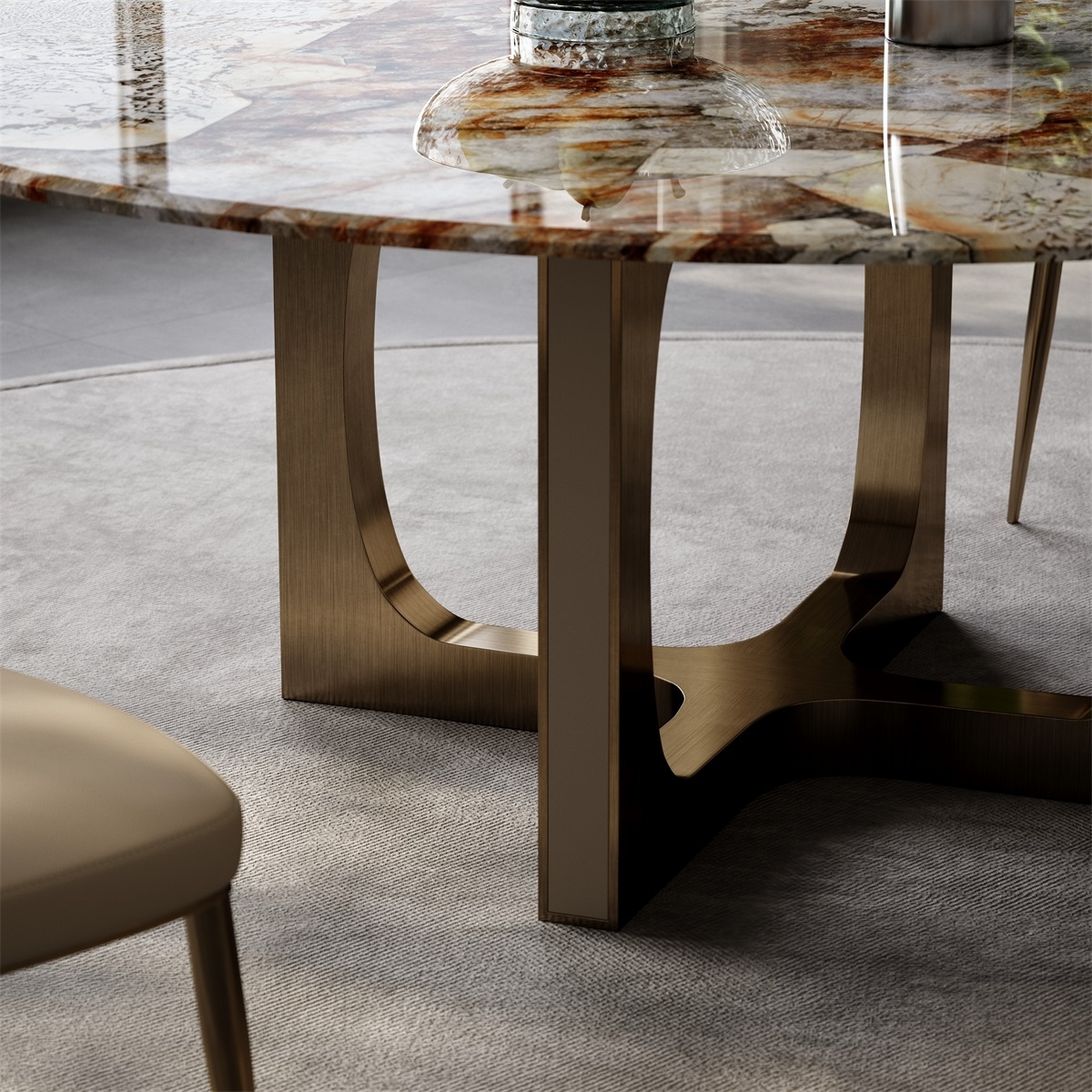 The countertop is made of natural rock slabs with a unique texture like an art painting. After high-temperature calcination and anti-seepage treatment, it is wear-resistant, stain-resistant and has its own high-level tension. The base is made of metal, with hard lines and warm luster interwoven, and matched with the color embellishment of art ornaments.