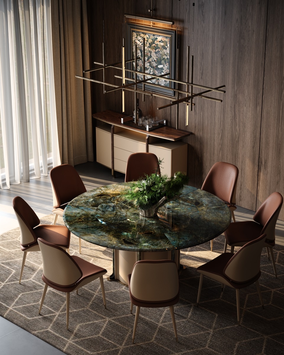 The orderly arranged luxurious stone columns echo the built-in turntable on the table.