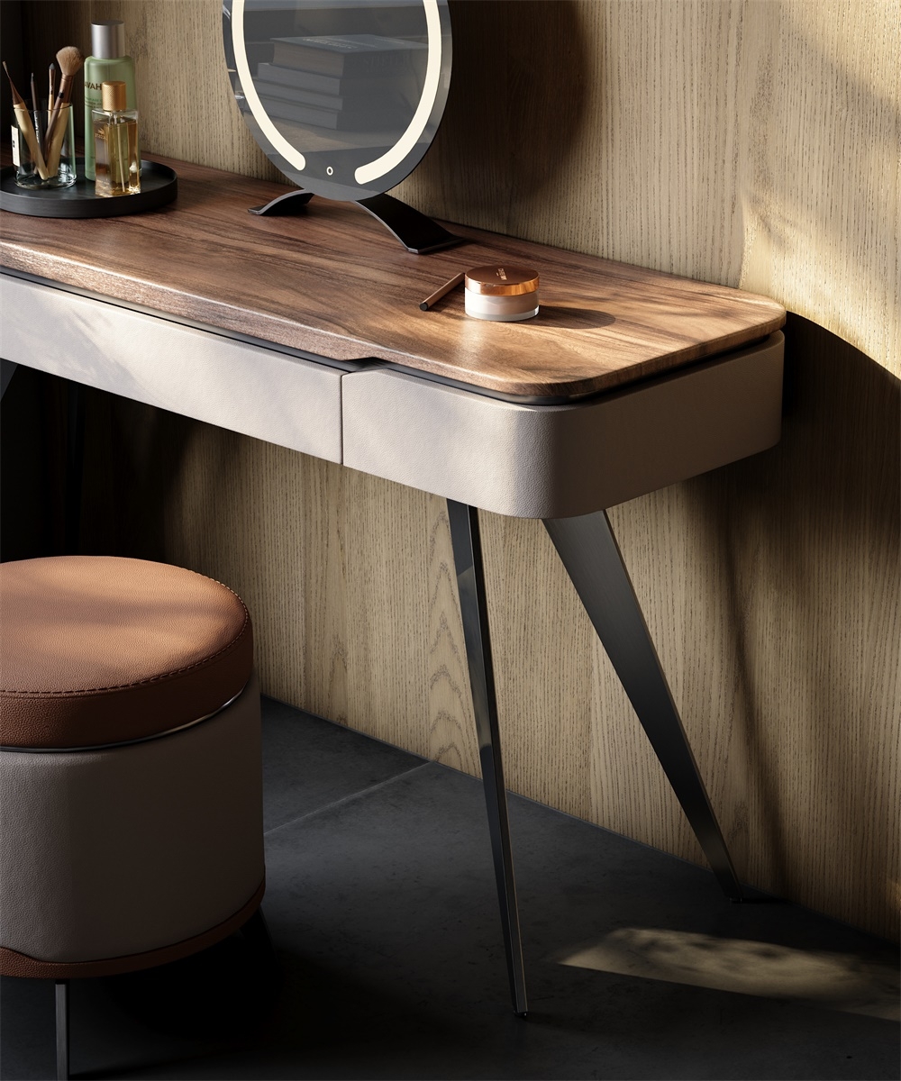 The leather stitching is CNC sewing + manual trimming, with a precise needle distance of 0.2mm to fit the texture; the joints between the metal bracket and various materials are laser-welded + manually polished, smooth and burr-free; the annular mirror is matched with the table top, and is manually adjusted to adapt the angle and brightness to the beauty scene, integrating "exquisite detailism" into every makeup structure.