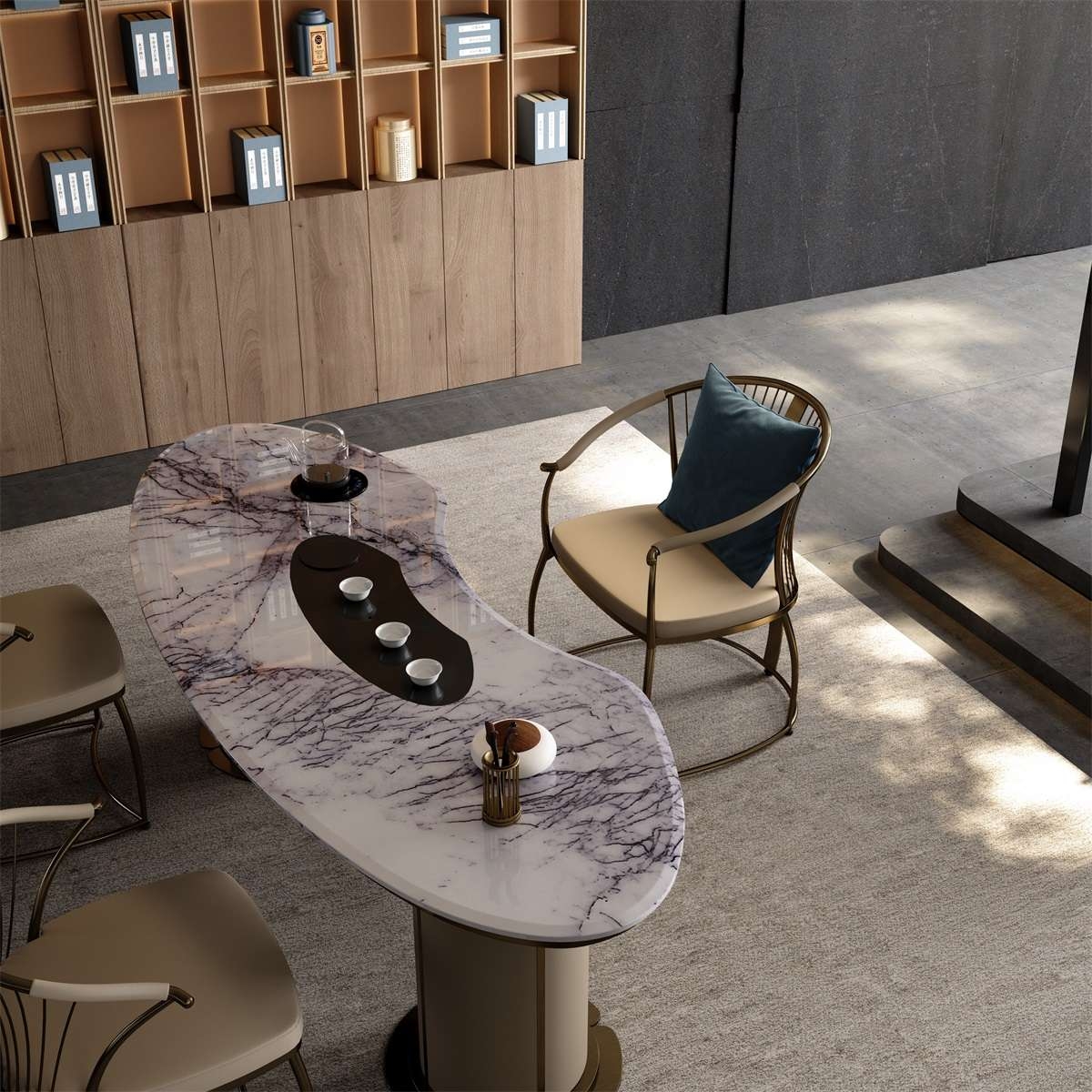 The design of the armchair perfectly blends modernity with traditional elements. The backrest is composed of vertical metal strips, which are both lightweight and rhythmic. The chair seat is made of soft cushioning material, providing just the right amount of comfort.