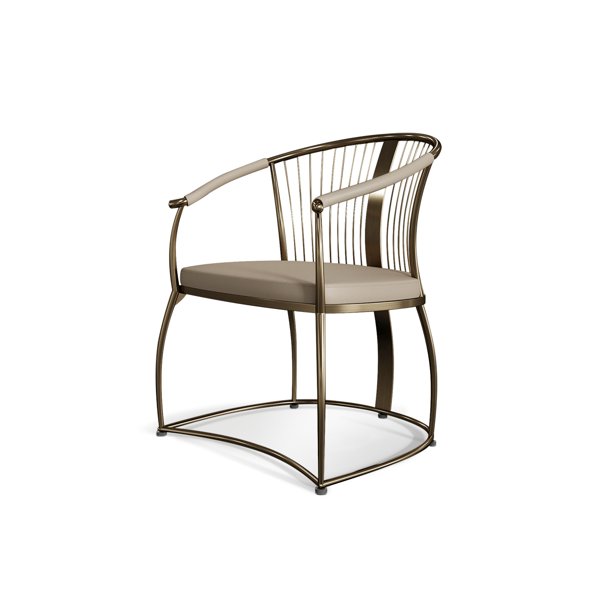 Yue is an attitude towards life, and true happiness lies in ordinary life. Maintaining a happy heart turns into beautiful notes.Elevate your space with this stunning armchair. The frame, crafted from polished bronze - toned metal, features an elegant, curved design. Upholstered in soft, beige leather on the seat and armrests, it offers both comfort and a touch of luxury.Perfect for a modern living room or as a statement piece in any refined interior, this chair blends contemporary style with timeless elegance.