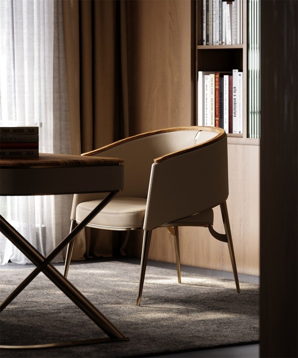 The design of the columns brings a more stable and artistic structure to the building. The modern minimalist style is used to reshape the shape, symbolizing love and responsibility.Luxury Material Mix:Combines beige leather upholstery, wooden armrest trim, and metallic legs. Creates an upscale, refined look.