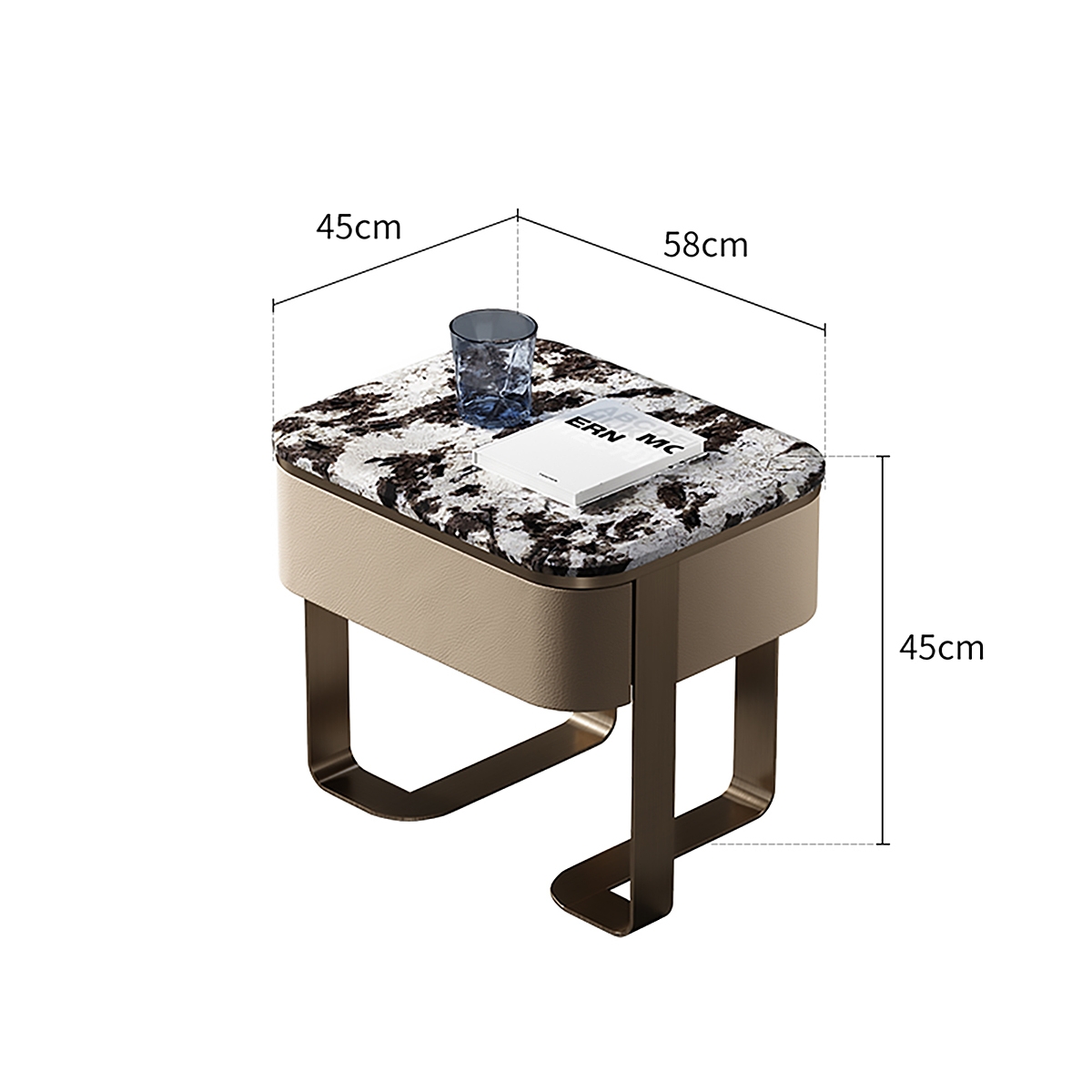 The geometric design of rectangular frame + curved table top breaks the stereotyped lines and adapts to various home styles; the open table top can meet the needs of temporary storage, such as water cups, books, and aromatherapy. The combination of "leather soft cover + metal bracket" not only ensures stability, but also creates a sense of lightness visually, making the side table move from "monotonous storage" to "aesthetic display"