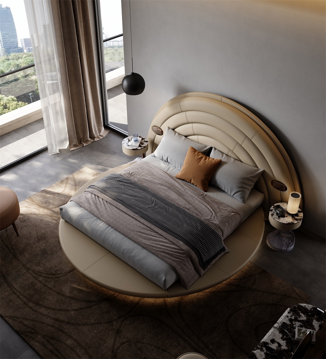 The countertop and base are made of natural iridescent rock slabs with a texture like an art painting. After high-temperature calcination and anti-seepage treatment, they are wear-resistant, stain-resistant and have their own artistic tension. The middle cabinet is covered with genuine leather. The light brown tone is delicate and skin-friendly. After the ecological tanning process, it is soft to the touch and wear-resistant.