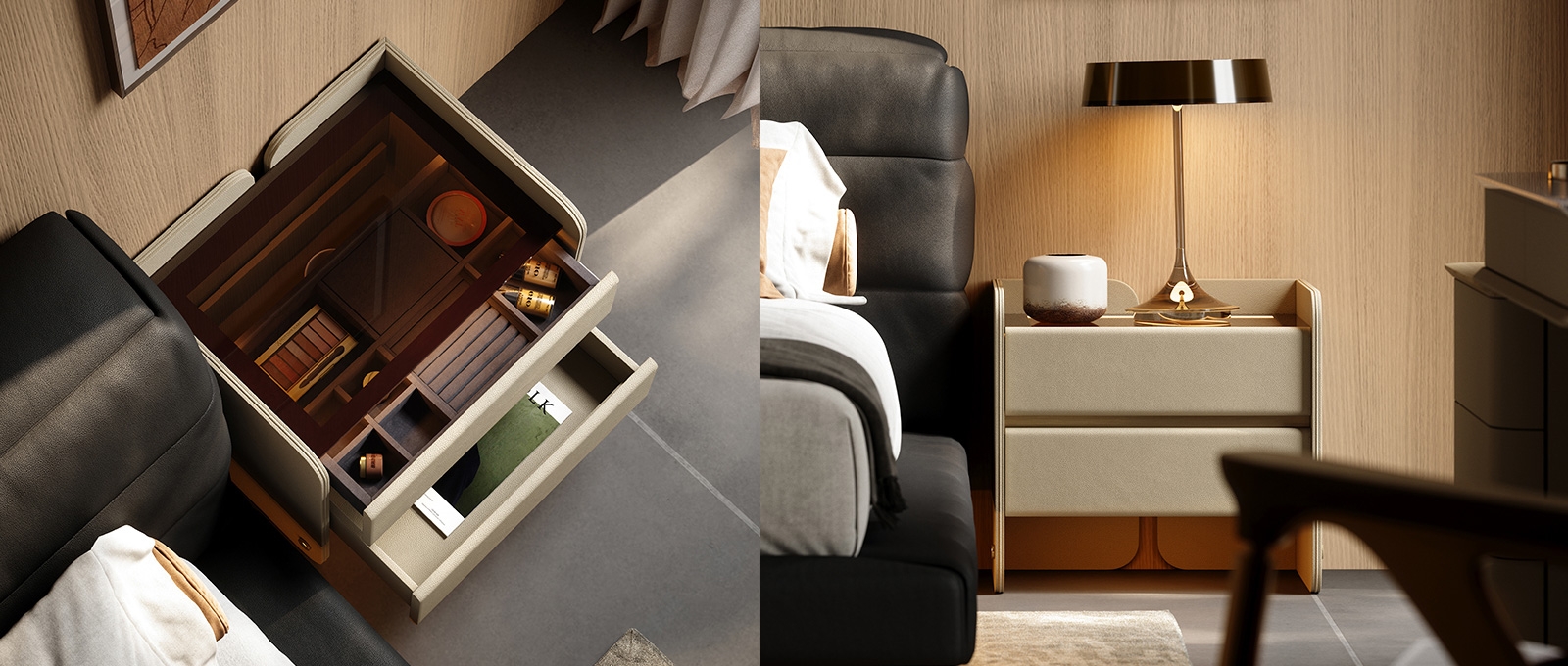 In a rest space that focuses on creating bedroom atmosphere and storing things before going to bed, this bedside table combines genuine leather, metal, and solid wood, with a clever double-drawer design, making it an "intimate partner" by the bed, turning every time you tidy up before going to bed into a healing experience that blends with quality life.